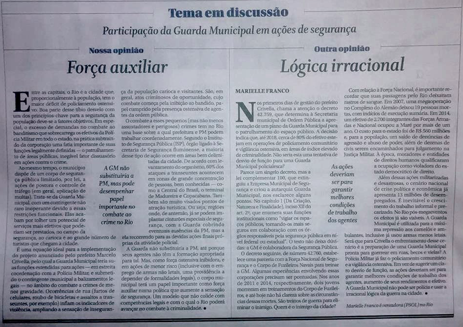 2 • Publicamos um Artigo contrapondo a opinião do Jornal O Globo sobre o papel da Guarda Municipal na política segurança do Rio de Janeiro.